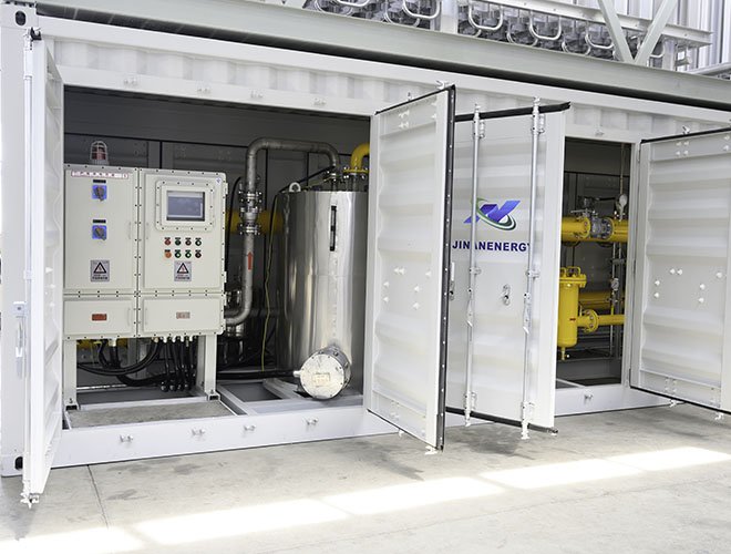 調(diào)壓計(jì)量撬是經(jīng)過主氣化器氣化后的氣體,由于等壓氣化壓力基本保持和儲(chǔ)罐壓力相近,一般用戶需求壓力是一個(gè)恒定的范圍內(nèi)的值,需要進(jìn)行調(diào)壓穩(wěn)壓。同時(shí)為了計(jì)量核算費(fèi)用或廠內(nèi)核算成本,對(duì)氣化后的LNG流量進(jìn)行計(jì)量,為了實(shí)現(xiàn)以上的功能組合在一起的裝置叫調(diào)壓計(jì)量撬。由矩形撬塊、調(diào)節(jié)匯管、控制閥、計(jì)量管、流量計(jì)、調(diào)節(jié)閥、調(diào)節(jié)管、過濾器、出氣管、進(jìn)氣匯管、進(jìn)氣口、出氣匯管、排污管和安全放氣閥組成。有的裝置內(nèi)需要加入加臭系統(tǒng)。
