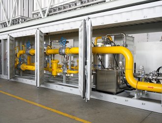 LNG調(diào)壓計(jì)量撬是液化天然氣經(jīng)過主氣化器氣化后的氣體, 由于等壓氣化壓力基本保持和儲(chǔ)罐壓力相近, 一般用戶需求壓力是一個(gè)恒定的范圍內(nèi)的值,需要進(jìn)行調(diào)壓穩(wěn)壓。同時(shí)為了計(jì)量核算費(fèi)用或廠內(nèi)核算成本,對(duì)氣化后的LNG流量進(jìn)行計(jì)量, 為了實(shí)現(xiàn)以上的功能組合在一起的裝置叫LNG調(diào)壓計(jì)量撬。LNG調(diào)壓計(jì)量撬由矩形撬塊、調(diào)節(jié)匯管、控制閥、計(jì)量管、流量計(jì)、調(diào)節(jié)閥、調(diào)節(jié)管、過濾器、出氣管、進(jìn)氣匯管、進(jìn)氣口、出氣匯管、排污管和安全放氣閥組成??筛鶕?jù)用戶的需要,配套加入加臭、加藥系統(tǒng)。